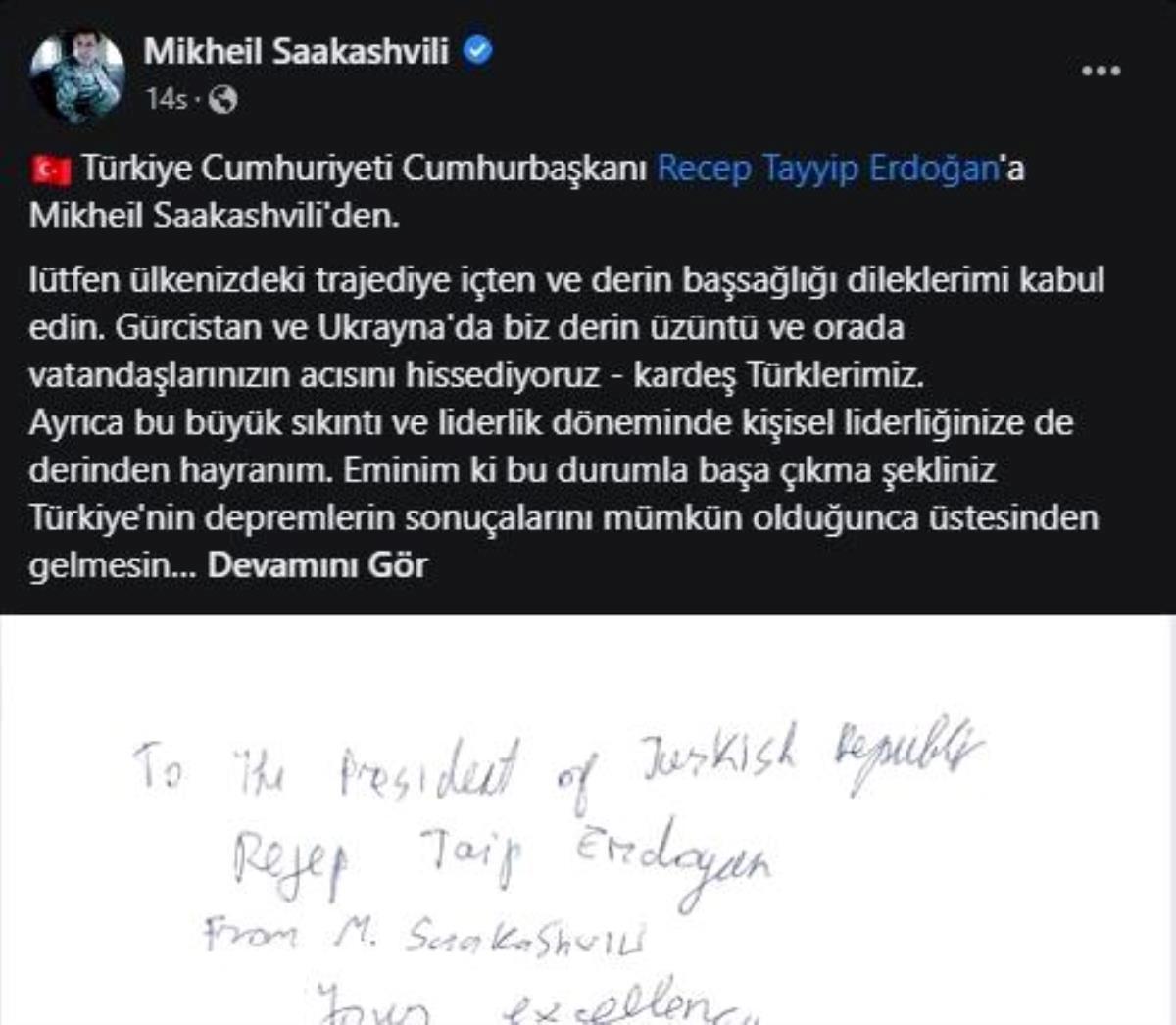 Saakaşvili, resmi toplumsal medya hesabından Türkçe yayınladığı iletisinde, “Ülkenizde yaşanan trajedi nedeniyle içten ve derin başsağlığı dileklerimi lütfen kabul edin. Yaşanan trajediden ötürü Gürcistan ve Ukrayna’da derin keder duyuyoruz ve oradaki vatandaşların, kardeşlerimiz Türklerin acısını hissediyoruz” dedi.